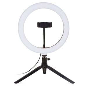 Práctico trípode com aro de luz incorporado para iluminar o teu rostro de modo professional....