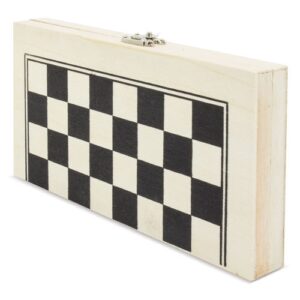 Prático xadrez apresentado em forma de estojo dobrável, de madeira e comapliques metálicos, na qual...