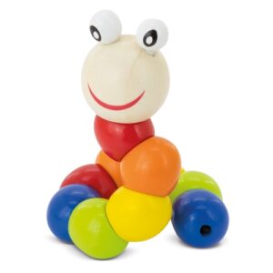 Divertida minhoca articulada fabricada de madeira, cada peça apresentada em bolsa individual.