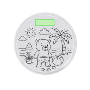 Caneta anti-stress giratória com detalhes das bandeiras espanhola, francesa e italiana. Escrita azul